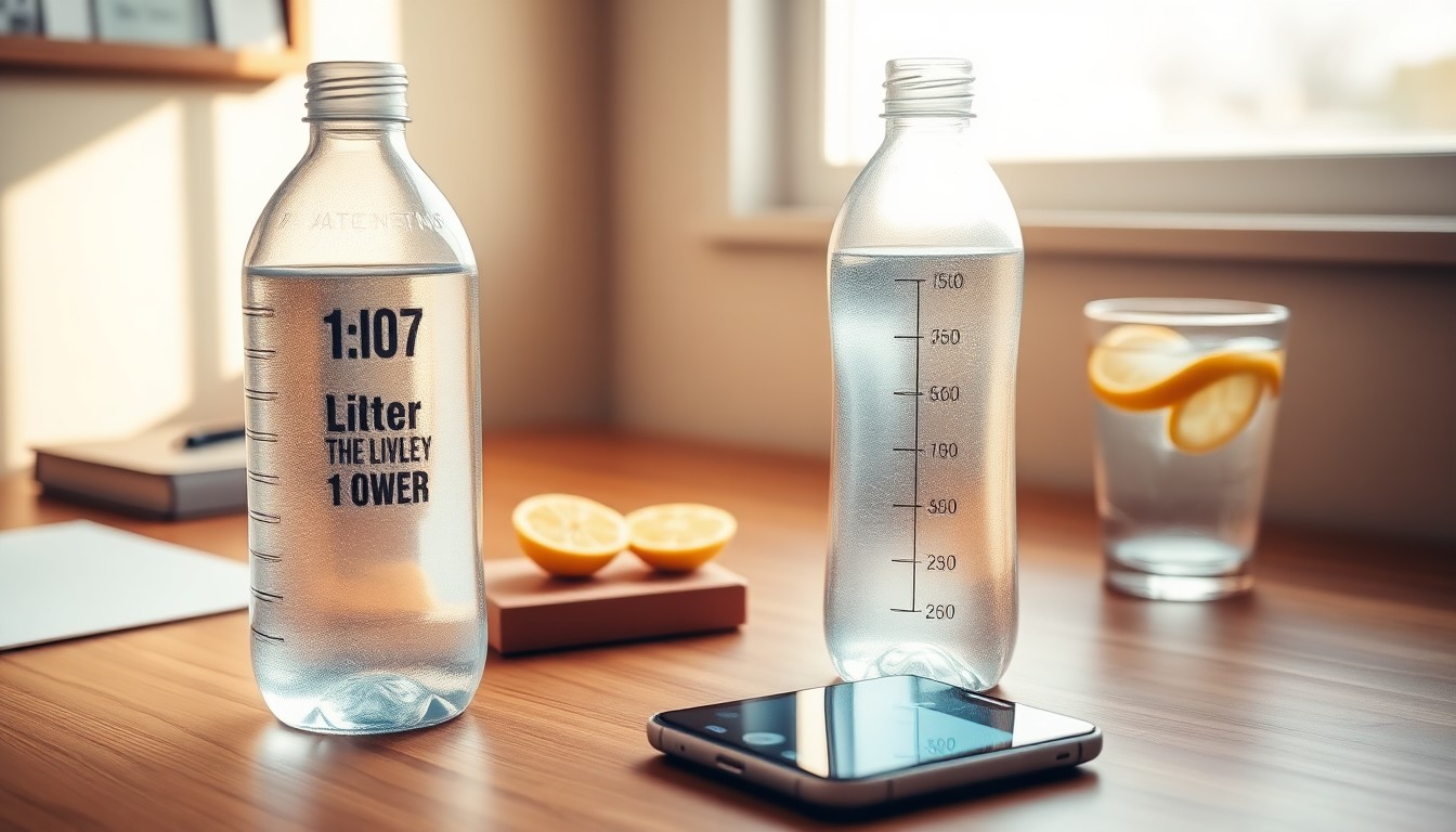 اشتري زجاجة 1 لتر بعلامات كل 250 مل — ابحث في أمازون عن 'زجاجة ماء مع مؤشر وقت'، مثل 'Time Marker Water Bottle 1L'. تكون شفافة عشان تشوف الكمية.