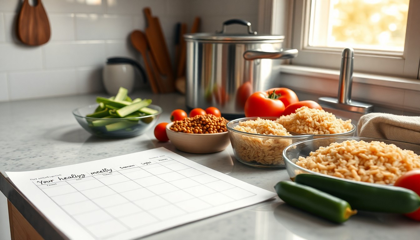 اختر 3-4 وصفات رئيسية للأسبوع — ركز على وصفات تستخدم مكونات متشابهة لتقليل الشراء. مثال: شوربة عدس، معكرونة بالخضروات، وأرز بالبازلاء.