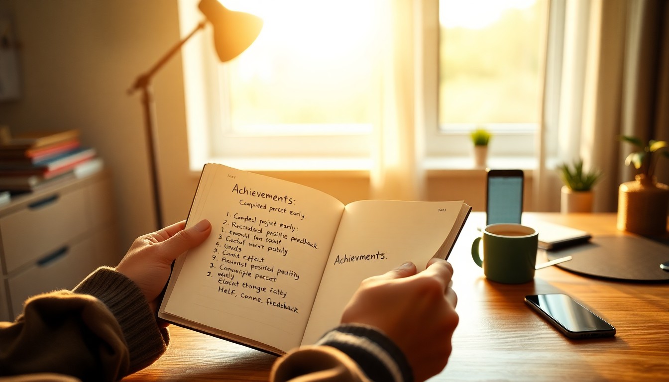 اكتب ثلاثة أشياء — سجل إنجازات ملموسة: 'أكملت تقرير المشروع قبل الموعد'، 'ساعدت زميلاً في حل مشكلة تقنية'، 'تلقيت إشادة من مديري'. تجنب العموميات.