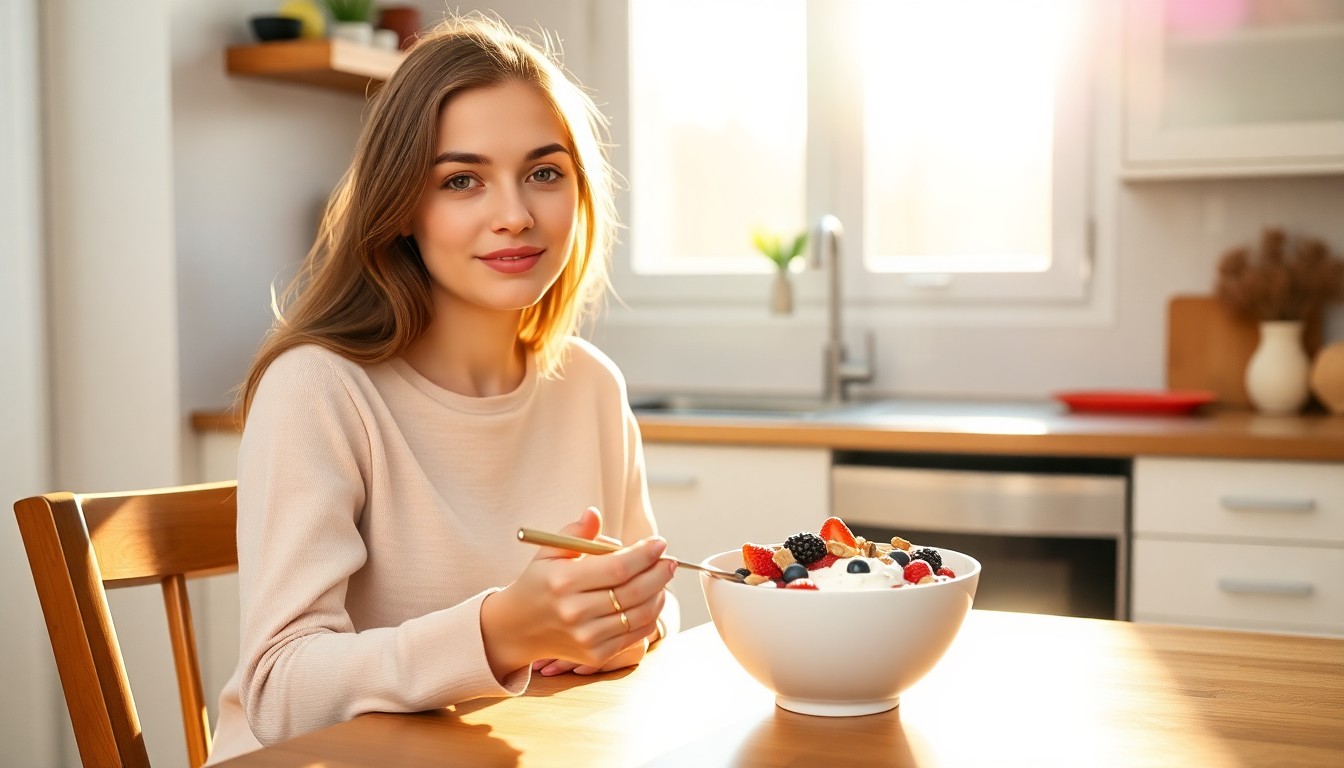 Morgens auf süße Cerealien verzichten — Ersetze Cornflakes oder Marmeladenbrot durch 2 Eier mit Avocado oder einen griechischen Joghurt mit Nüssen. Der Blutzucker bleibt so über Stunden stabil.