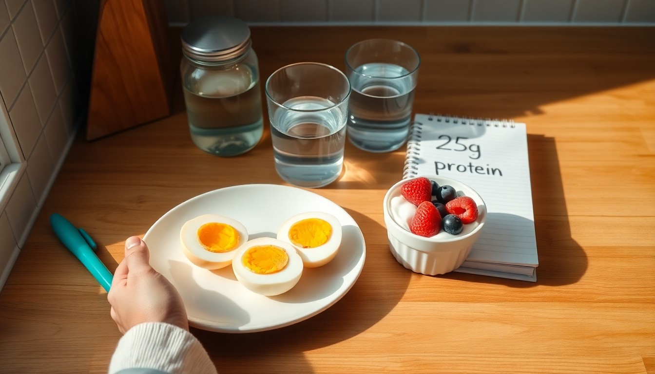 Calculate your protein needs — Aim for 25-30g of protein at breakfast. For reference: 3 eggs = 18g, 1 cup Greek yogurt = 20g, 1 scoop protein powder = 25g.