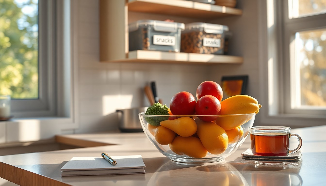 Clear your countertops — Remove all food from countertops. Store fruits and vegetables in a clear bowl on the counter—studies show you're 3 times more likely to eat what's visible.