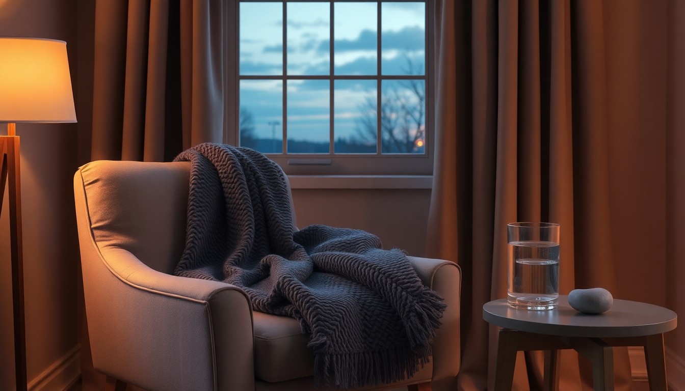 Add a weighted blanket — A 15-20 pound weighted blanket provides deep pressure stimulation that can lower cortisol. Drape it over the chair or couch.