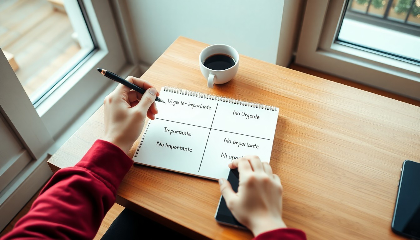 Dibuja un cuadrado dividido en cuatro — En una hoja A4 o en tu cuaderno, traza dos líneas perpendiculares. Arriba escribe "Urgente" e "Importante". Los ejes: horizontal = urgencia, vertical = importancia. Así quedan cuatro cuadrantes.