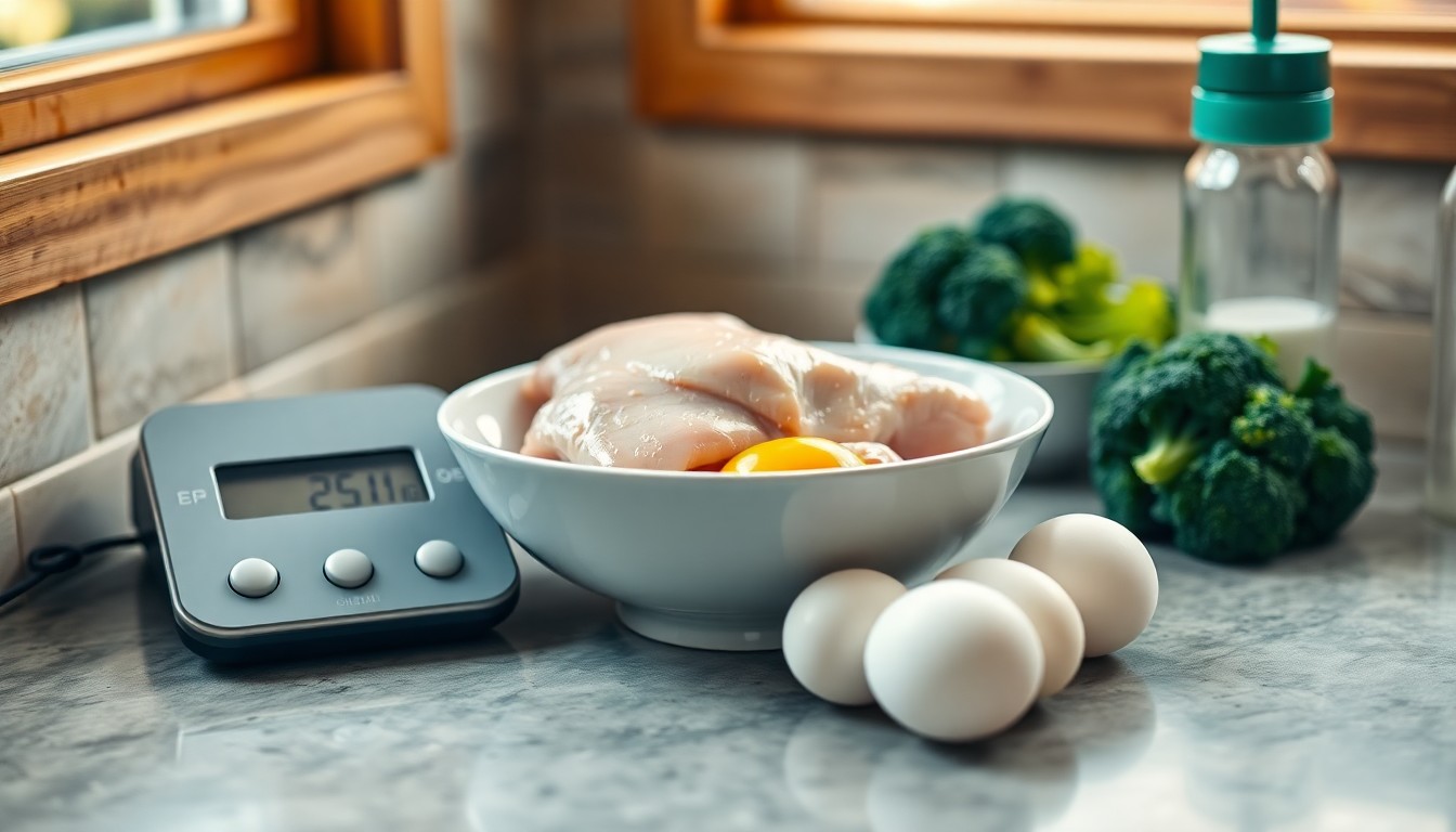 Protein kaynaklarını belirle — Tavuk göğsü (100g'de 31g protein), yumurta (1 adet 6g), lor peyniri (100g'de 12g), mercimek (100g'de 9g).