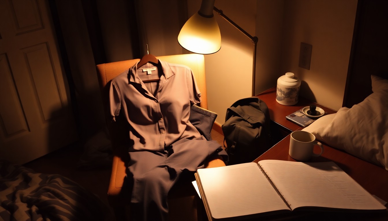Kıyafet seçin — Tam bir kıyafet kombinini (iç çamaşırı dahil) hazırlayın ve görünür bir yere asın. Hava durumuna göre ceket veya şemsiye ekleyin.