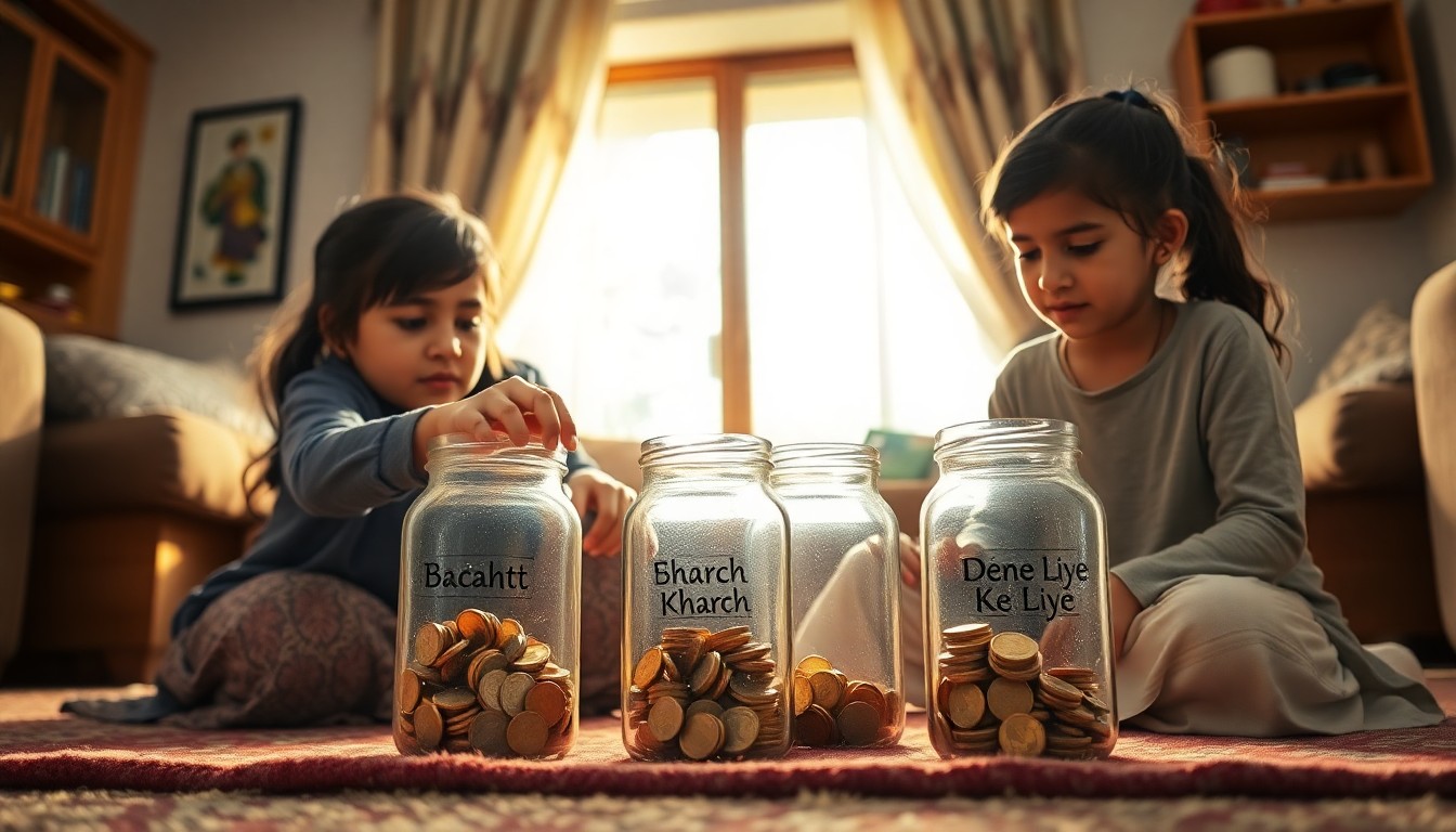 تقسیم کا اصول سکھائیں — بچے کو سکھائیں کہ ہر ہفتے کی رقم کو تین حصوں میں بانٹنا ہے: 50% بچت کے جار میں، 30% خرچ کے جار میں، 20% دینے کے جار میں۔