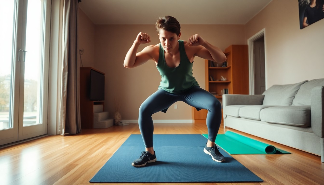پہلی مشق: اسکواٹ جمپس (20 سیکنڈ) — پاؤں کندھے کی چوڑائی پر رکھیں، اسکواٹ میں جائیں اور پھر اوپر چھلانگ لگائیں۔ ہاتھ سر کے اوپر لے جائیں۔